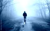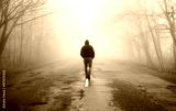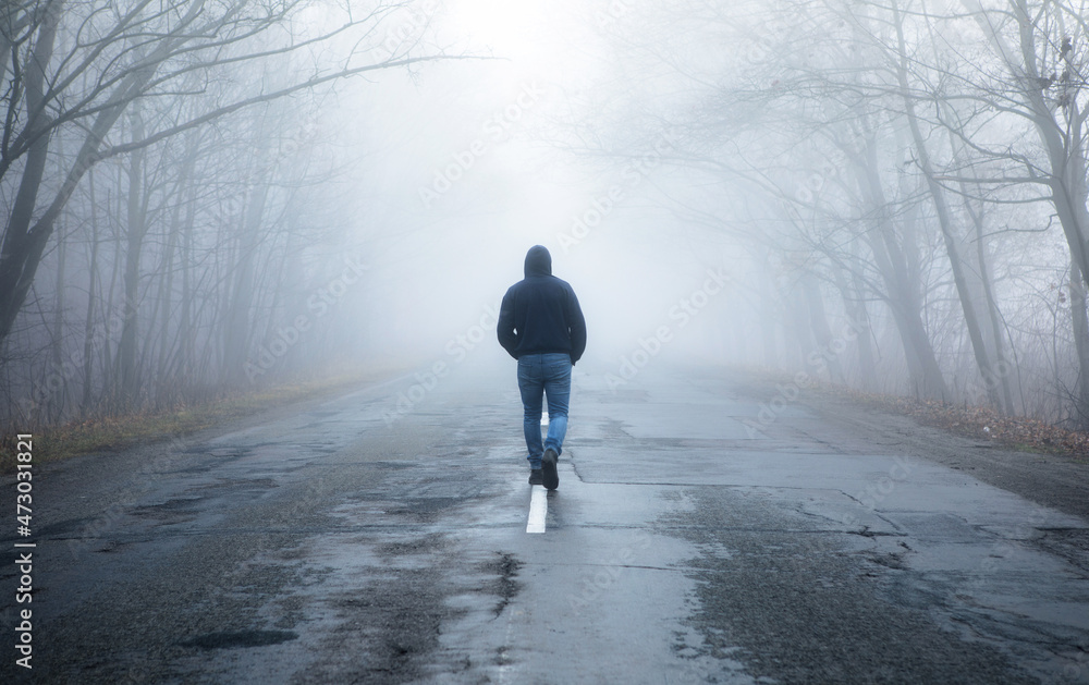 Lonely man walking in fog away road. Rural landscape with road in morning mist. Warm autumn colors. Dark mysterious background