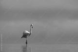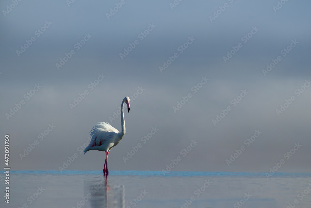 Wild african birds. Group birds of white african flamingos walking around the blue lagoon on a sunny day