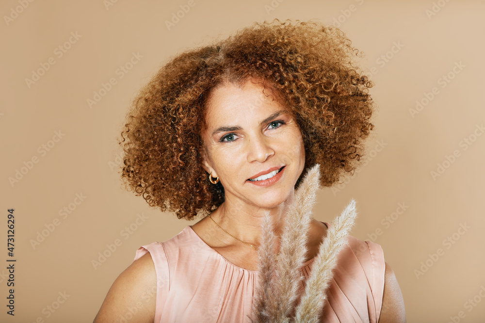 Fashion studio portrait of stylish middle age woman posing on beige background, 50 - 55 year old lady with curly hair holding pampas grass next to face