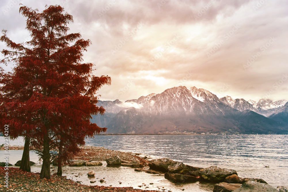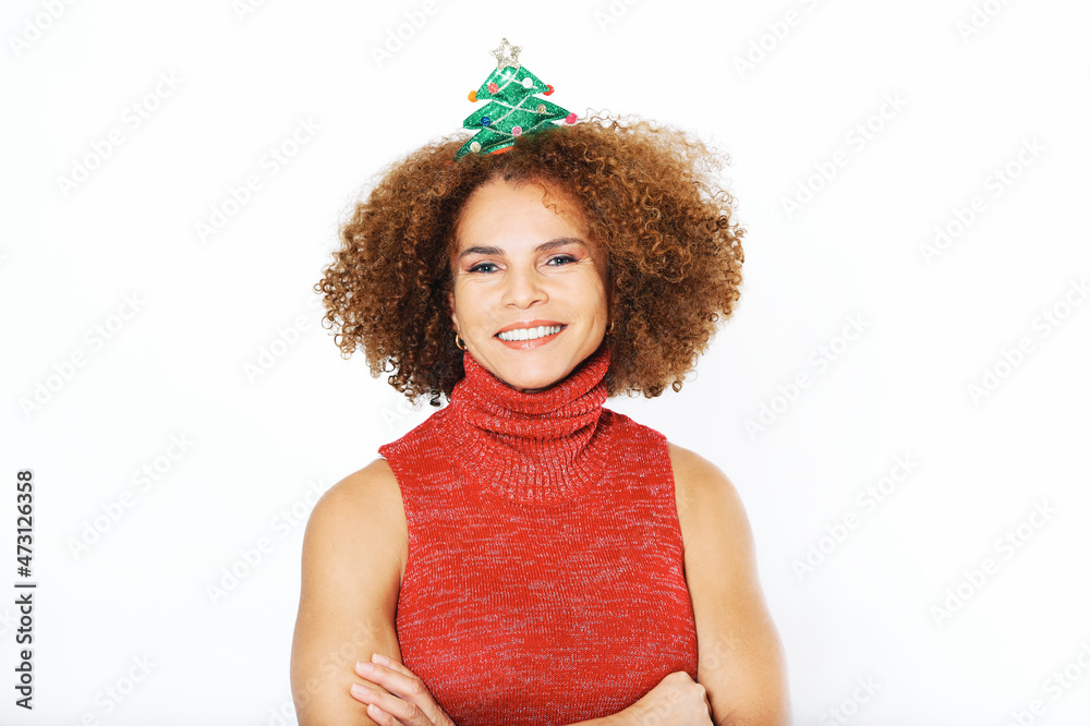 Studio portrait of happy beautiful middle age woman ready to celebrate Christmas and New Year, posing on white background, wearing red dress, mixed race african american lady with xmas tree haedband