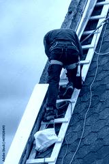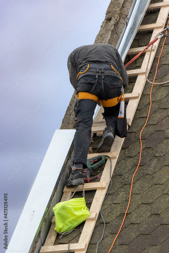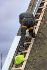 A man works on the roof repair, installs sheet metal on top of the gable wall
