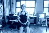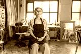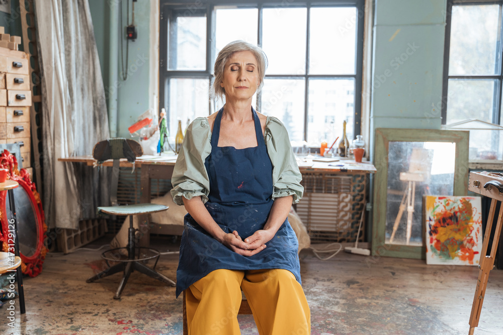 Mature female with closed eyes is sitting on chair and doing meditation in static position