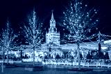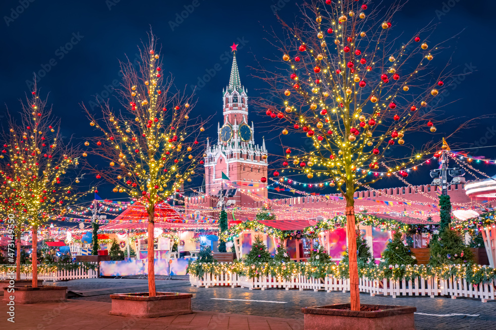 Moscow. Russia. Red Square on Christmas night. New Year in the center of Moscow. Celebrating Christmas on Red Square. Christmas market at walls of the Kremlin. Travel to Russia cities.