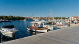 Hafen der Stadt Krk an der Adria in Kroatien mit der Altstadt im Hintergrund