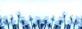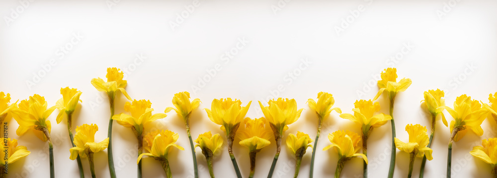 Beautiful Spring banner with fresh yellow daffodil flowers on white background.