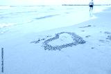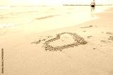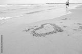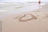 Sea beach with a heart on the sand. In the distance the silhouette of a lonely man. Blurred image.