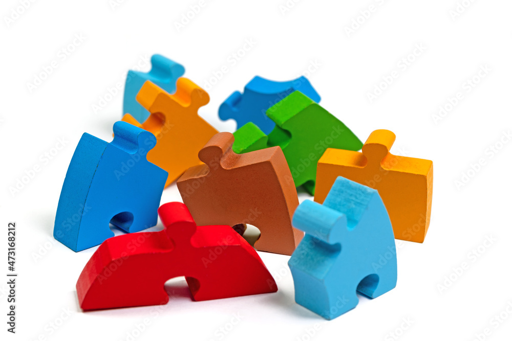 Bunte Puzzleteile aus Holz vor weißem Hintergrund