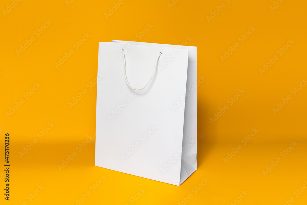Mockup of white shopping bag isolated over orange paper background. side view