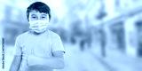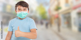 Child kid little boy wearing face mask against Coronavirus showing thumbs up in town Corona Virus COVID-19 Covid copyspace copy space