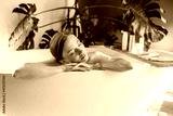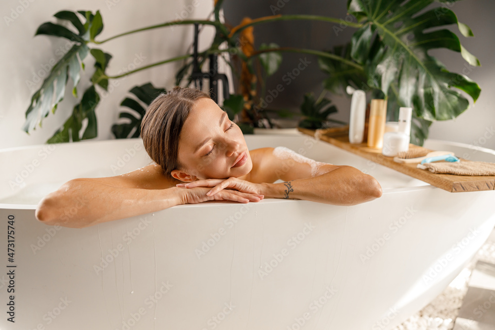 Dreamy young woman leaning on a bathtub side, relaxing with eyes closed at home. Wellness, beauty and care concept