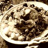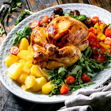 Grilled cooked whole chicken with grilled bell pepper and potatoes