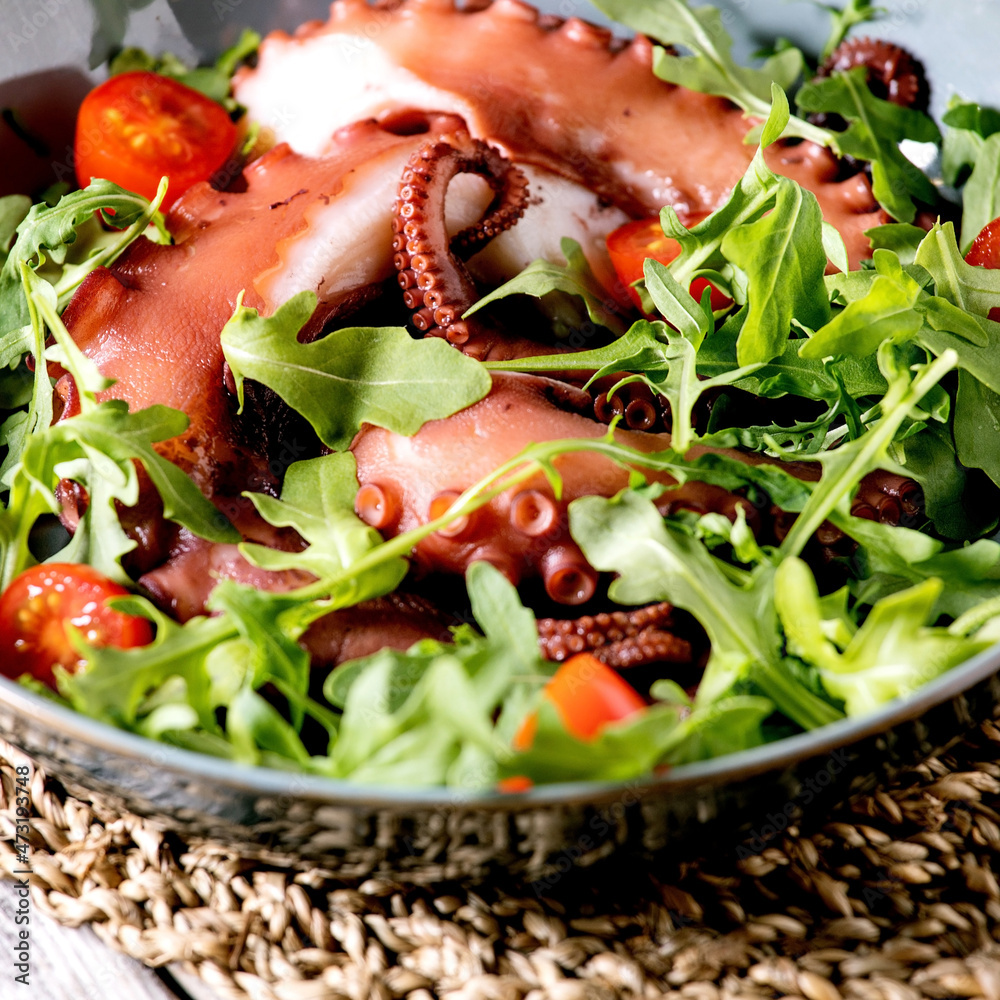 Coocked tentacles of octopus on blue ceramic plate with salad