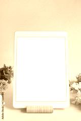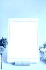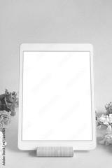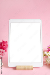 iPad pro tablet with white screen on pink color background flowers. Office design woman background
