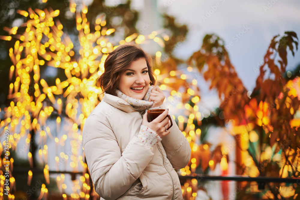 Winter portrait of happy young woman drinking hot chocolate outside at Christmas market