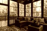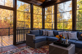 Cozy screened porch in early morning, rain drops on window and autumn leaves and woods in the background.