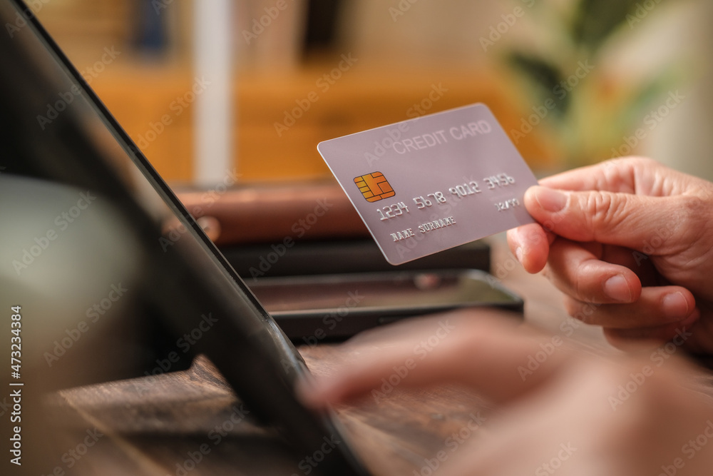 close up woman hand using credit card shopping online on mobile app on wood table at home