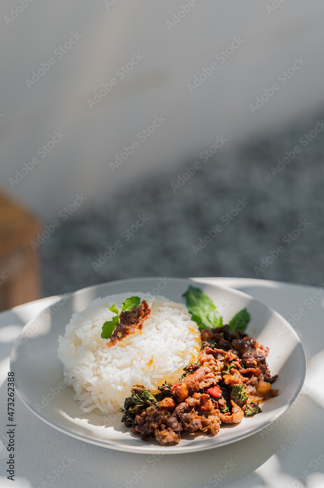 Traditional Thai Basil Beef, or Pad Gra Prow over white rice at restaurant,Street food,Food design concept background.