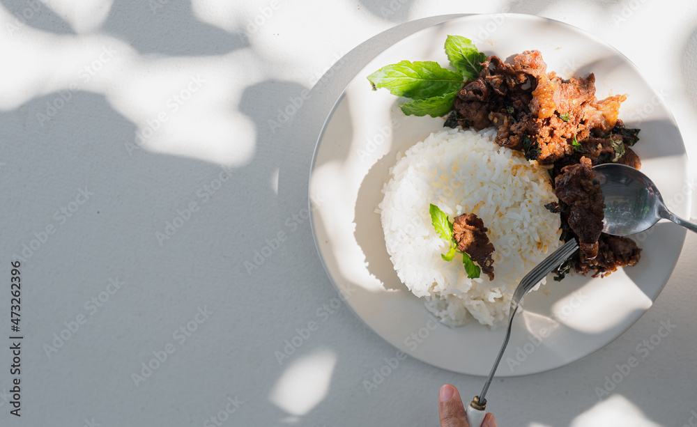 Traditional Thai Basil Beef, or Pad Gra Prow over white rice at restaurant,Street food,Food design concept background.