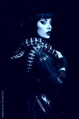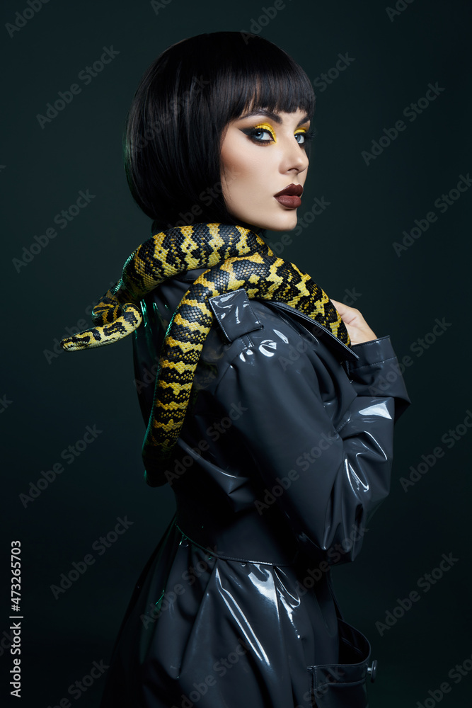 Beauty woman python yellow snake around her neck on latex shiny raincoat. Yellow snake on the shoulders of girl. Beauty yellow eye shadow makeup, dark burgundy lipstick