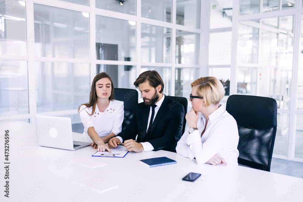 A group of young office workers dressed in business suits doing office work at a large conference table. The girl points to the documents.