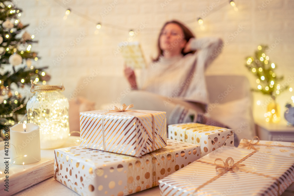Woman sitting on couch near christmas tree and packing handmade gift boxes putting it on the table. Presents for family.