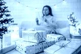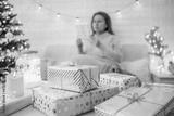 Woman sitting on couch near christmas tree and packing handmade gift boxes putting it on the table. Presents for family.