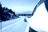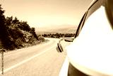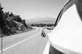 Woman driving a car holding straw hat from the open window. Trip on the serpentine road in the mountains. Summer vacation