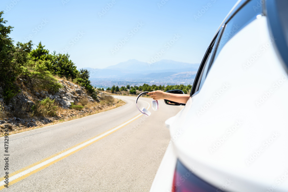 Woman driving a car holding headphones from the open window. Trip on the serpentine road in the mountains. Summer vacation