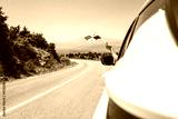 Woman holding Panama flag from the open car window driving along the serpentine road in the mountains. Concept