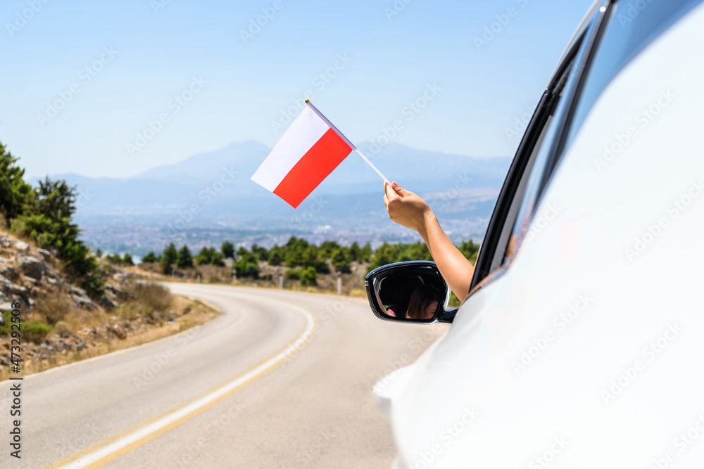 Woman holding Indonesia flag from the open car window driving along the serpentine road in the mountains. Concept