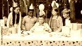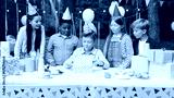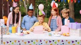 Portrait of happy child boy having fun to opening present at the table with his friends. Concept of surprise present, birthday gift, happy kids, childhood