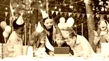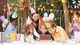 Wow. Many friends looking at the tablet together while celebrating birthday on a garden outside in the backyard