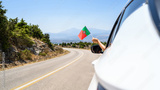 Woman holding Portugal flag from the open car window driving along the serpentine road in the mountains. Concept