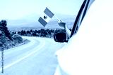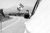 Woman holding Mexico flag from the open car window driving along the serpentine road in the mountains. Concept