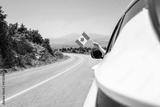 Woman holding Canada flag from the open car window driving along the serpentine road in the mountains. Concept