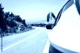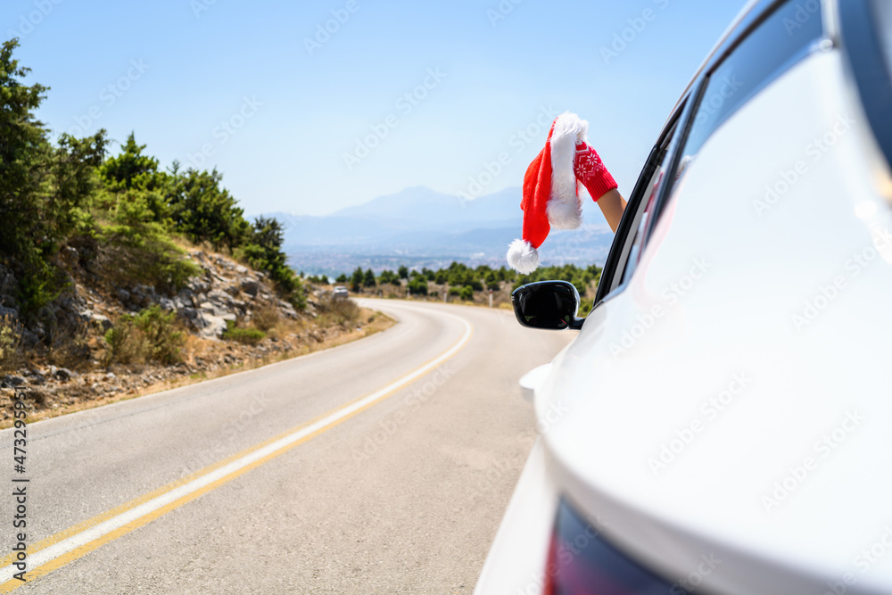Woman in christmas gloves driving a car holding santa claus hat from the open window. Trip on the serpentine road in the mountains.