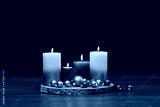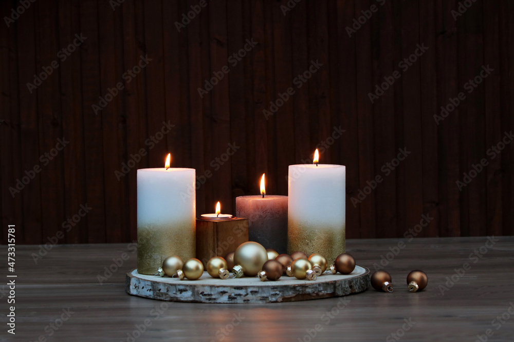 Weihnachtshintergrund: Kerzen mit Weihnachtskugeln auf einer Baumscheibe.