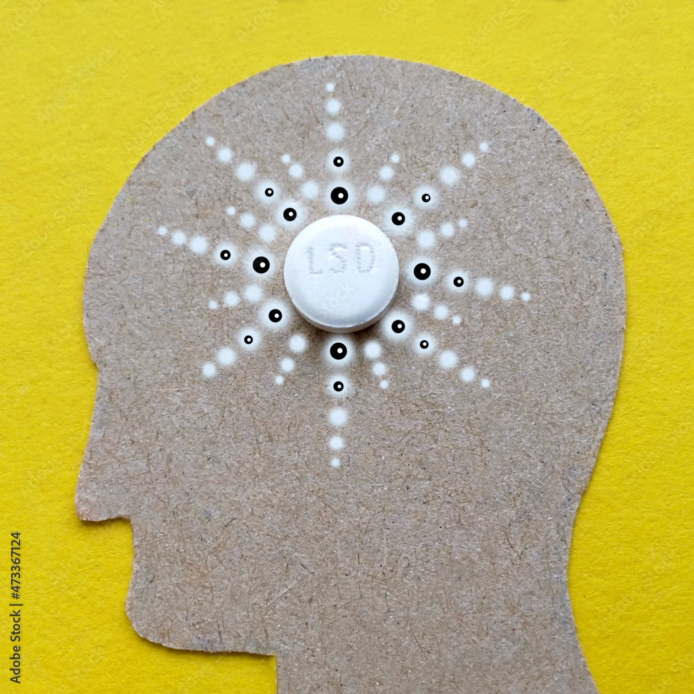 LSD pill in the head of the human brain, hallucinogenic trip insight and epiphany