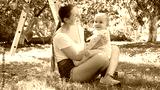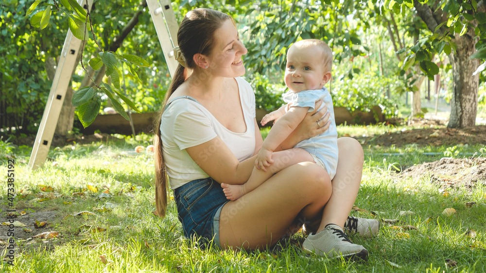Toned portrait of smiling woman sitting on grass and having good time with her little baby son
