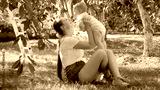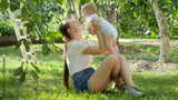 Happy family in garden. Mother playing with little baby boy on grass at orchard
