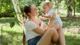 Portrait of smiling woman sitting on grass and holding her little baby son on sunny summer day