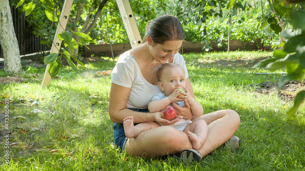 Smiling young woman sitting in garden with her little baby son and looking at him eating apples