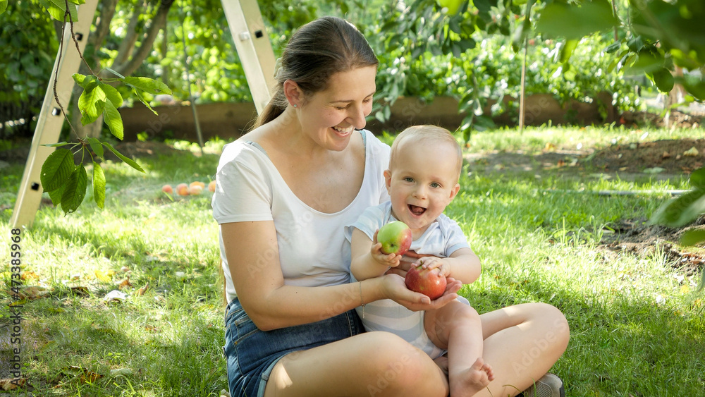 Young mother hugging and smiling at her baby son holding ripe red apples at house backyard garden. Concept of child development, parenting and healthy organic food growing.