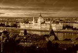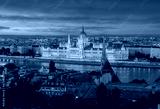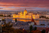 Illuminated Hungarian Parliament building at sunset in Budapest, Hungary