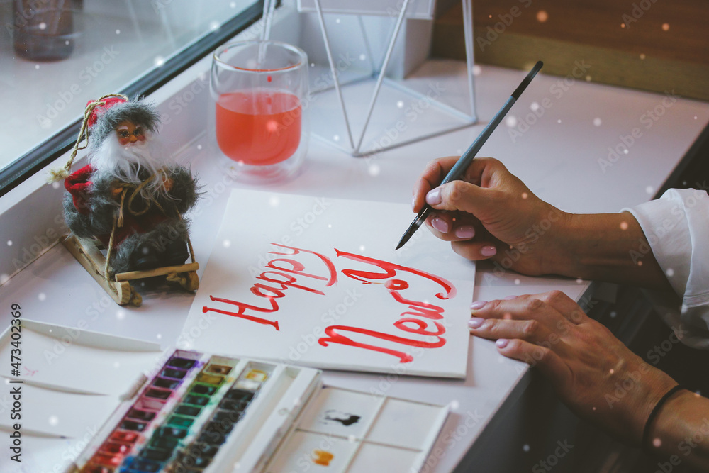 Artist draws inscription Happy New Year with red paint, brush on white sheet of paper. Festive background. Painter creates DIY hand made postcard for Christmas 2022 at snowy day. Toy Santa Clause.