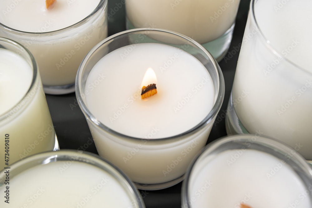 Handmade soy candle in glass cup with wooden wick. Natural. Scented candle for interior