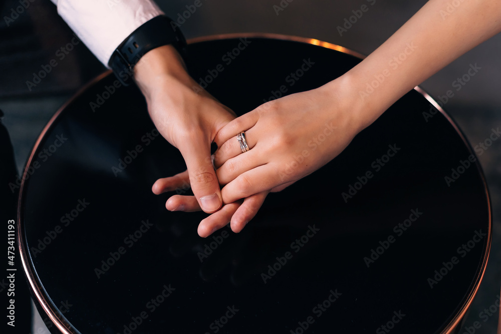 beautiful and expensive wedding ring on a woman's finger. couple holding hands over table. close up.