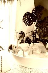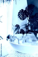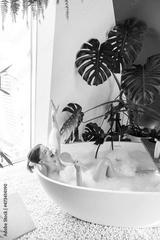Cute young woman singing into a brush while bathing in the bathtub decorated with tropical plant. Wellness, body care concept