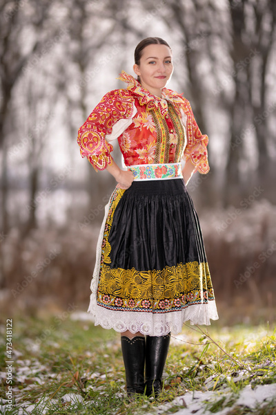 Young beautiful slovak woman in traditional dress. Slovak folklore