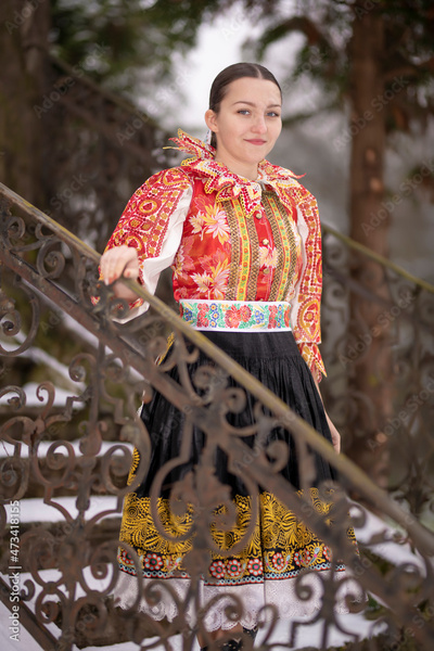 Young beautiful slovak woman in traditional dress. Slovak folklore